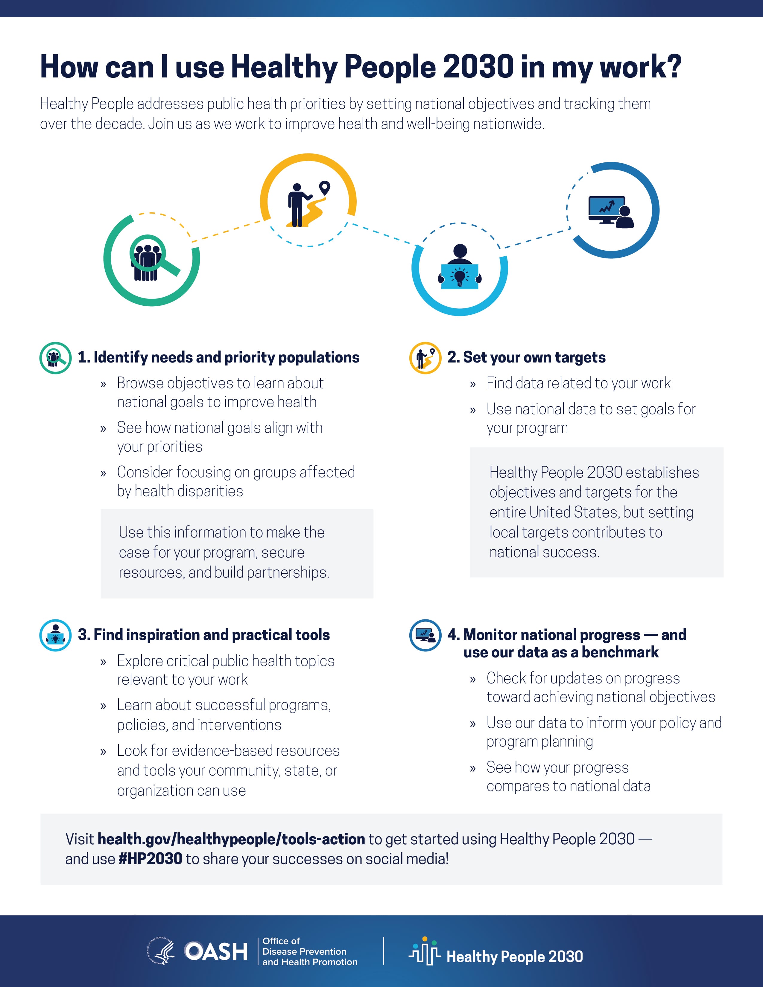 Communities, states, and organizations across the country use Healthy People objectives to set their own priorities — and you can, too. Our graphic explains the practical ways Healthy People 2030 can help you improve health and well-being through your work.